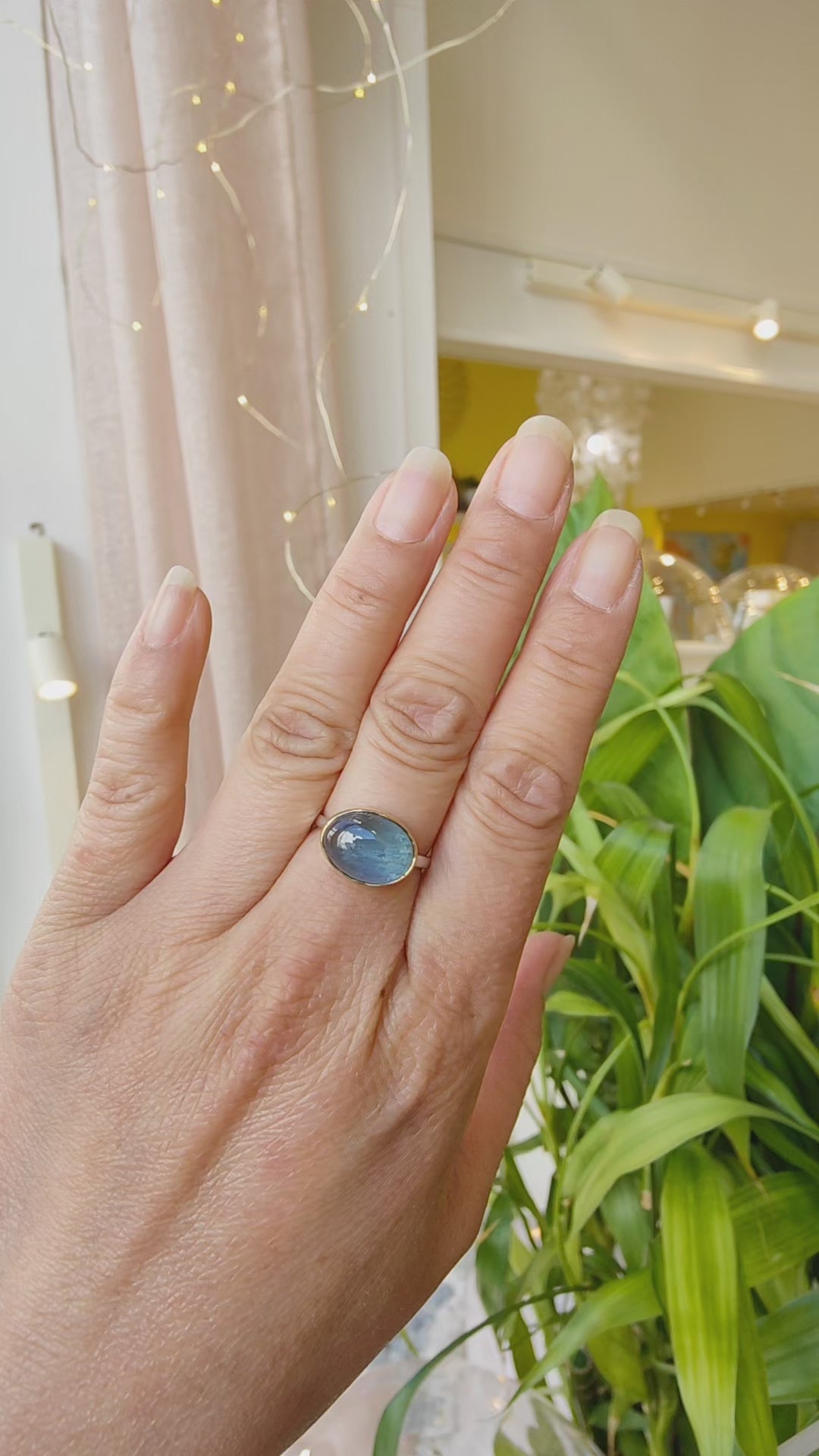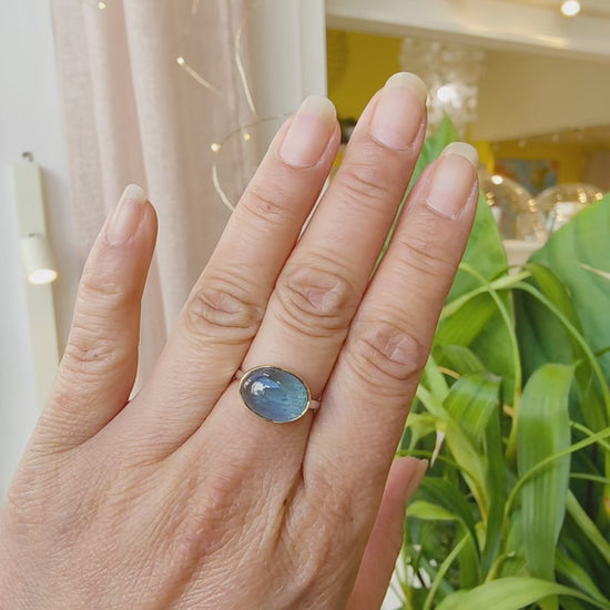 Le cabochon de l'aigue marine de 9 ct d'une taille de 1.3cm sur 1cm, est enchâssé dans du laiton doré à l'or fin et de l'argent massif.