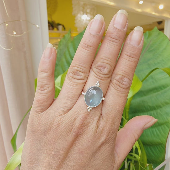 Le cabochon de l'aigue marine de 8 ct d'une taille de 1.6cm sur 1.3cm, est enchâssé dans de l'argent massif.