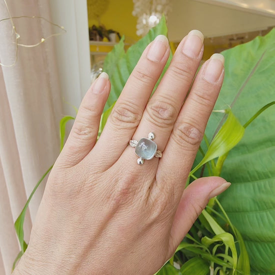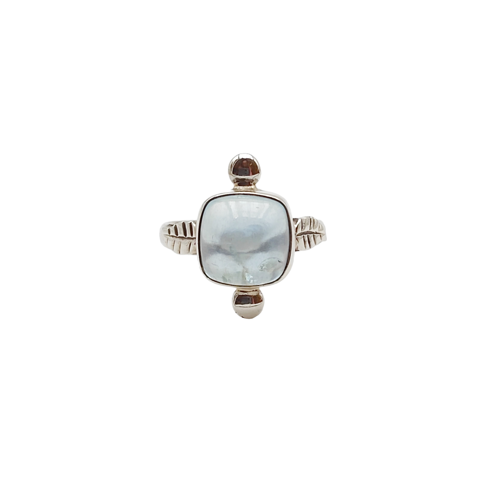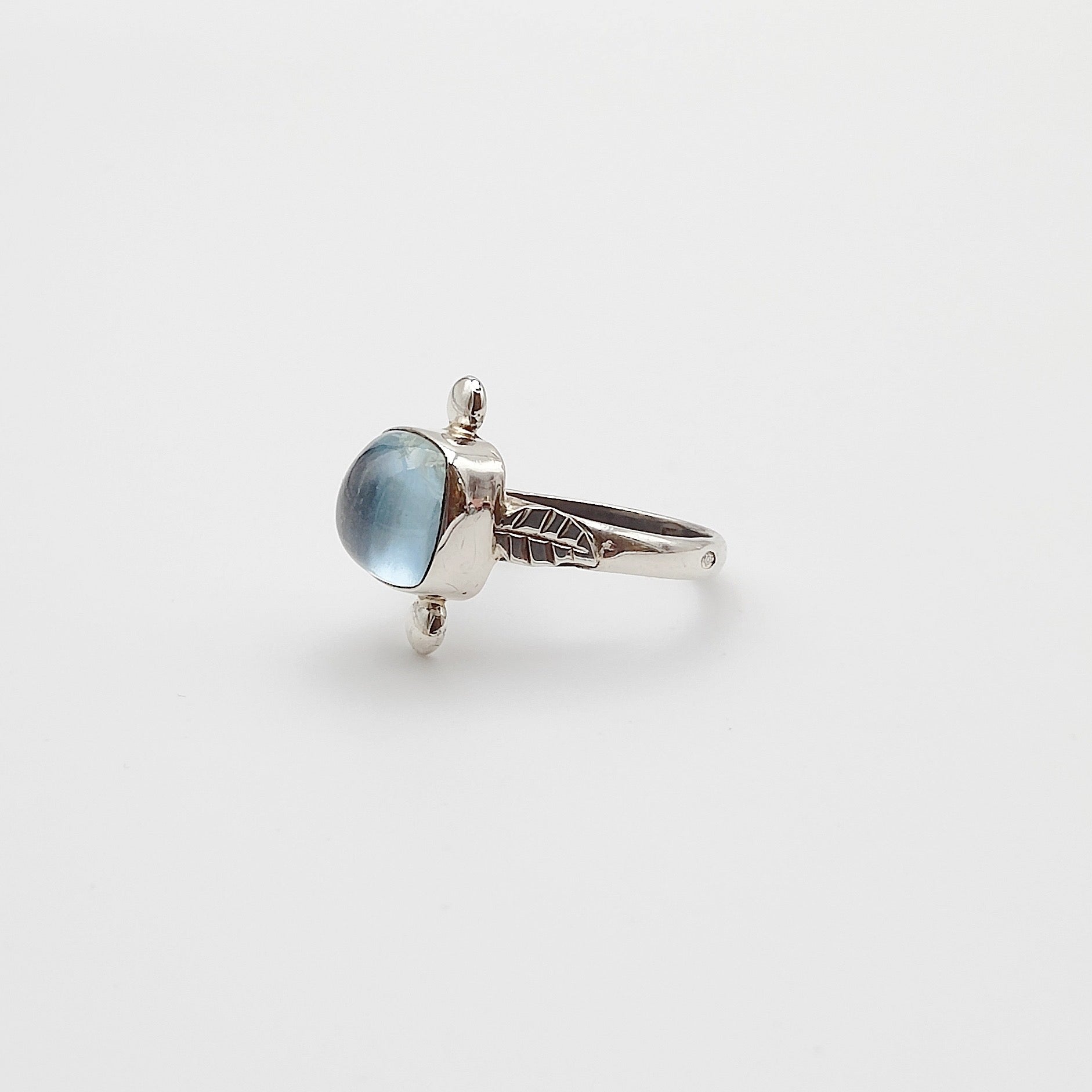 Le cabochon taille coussin de 1cm de l'aigue marine est enchâssé dans de l'argent massif.