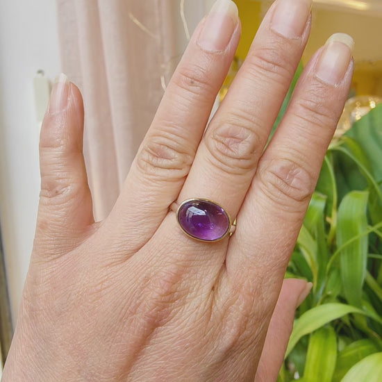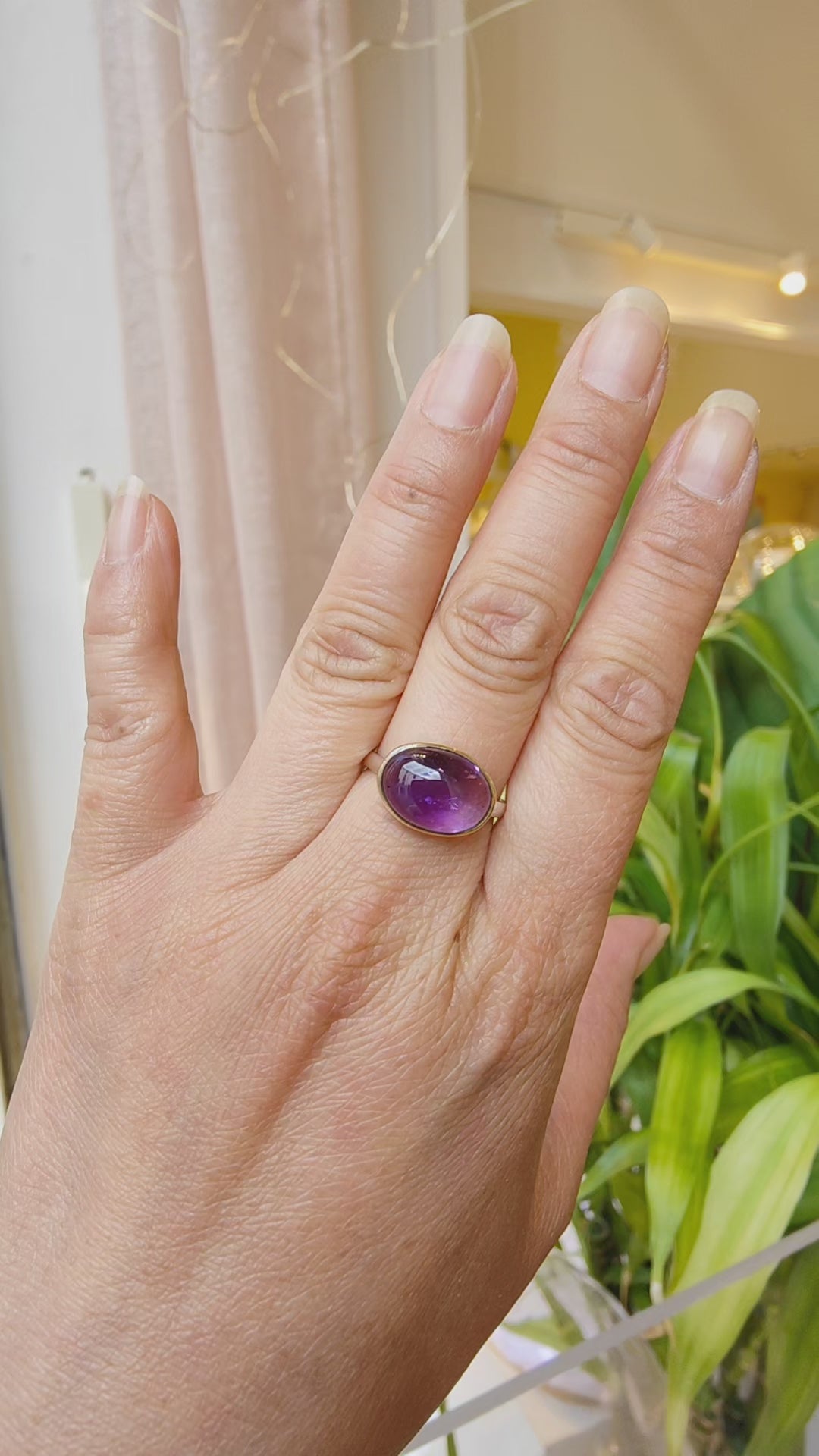 Le cabochon de l' Améthyste, de 6 carats d'une taille de 1.4 cm sur 1cm, est enchâssé dans du laiton doré à l'or fin et de l'argent massif.