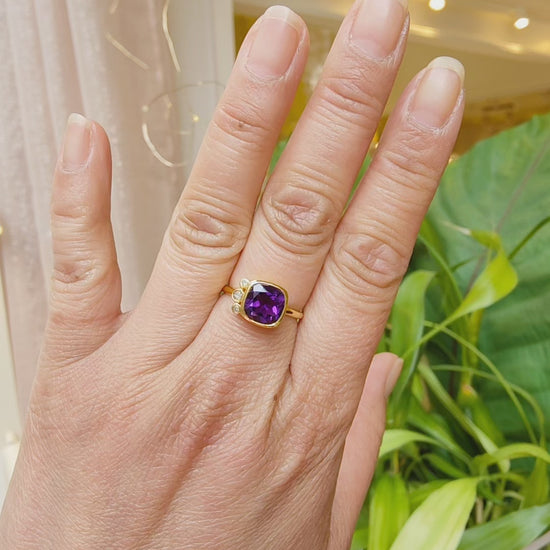 Le coussin facetté de l' Améthyste, d'une taille de 8mm, est enchâssé dans de l' argent plaqué or 3 microns, ainsi que les 3 petits diamants de 2 et 1mm