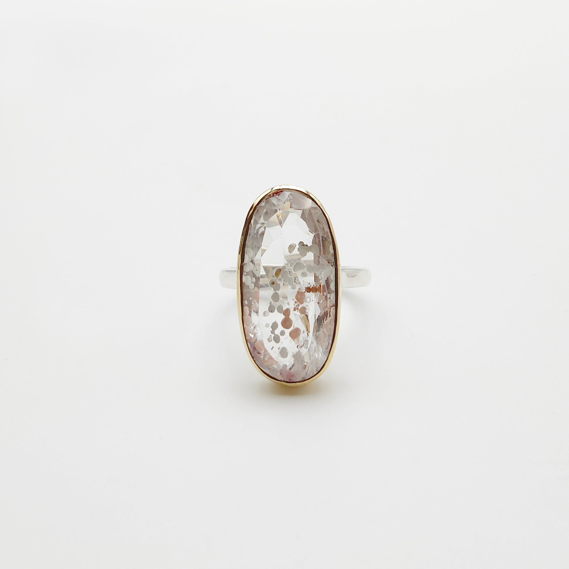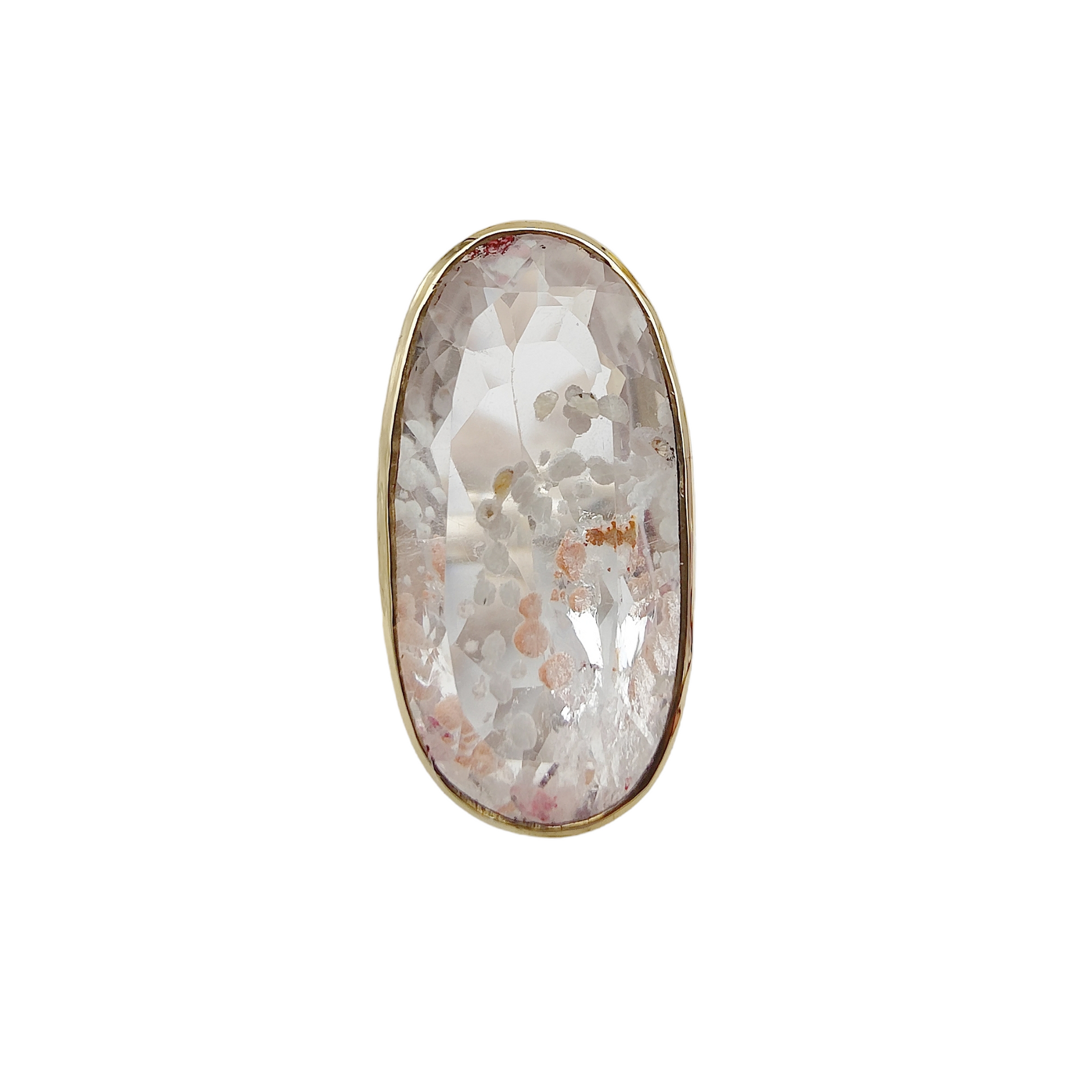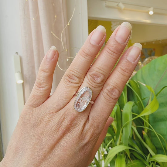 Cette magnifique bague est montée avec un quartz Cristobalite provenant du Brésil, avec des inclusions en forme de boules de neige blanche et rose