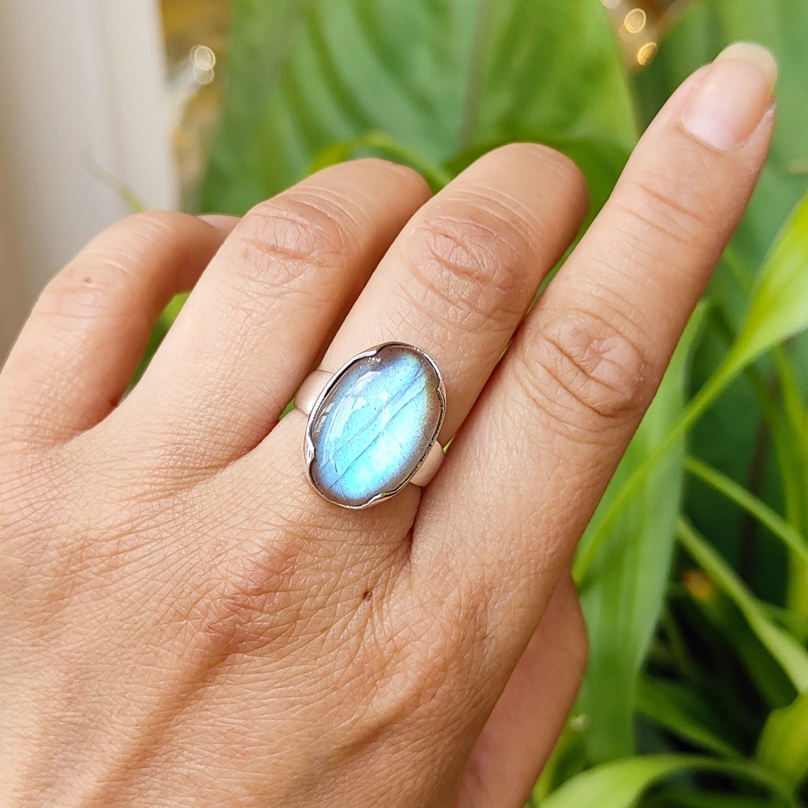 Élevez votre style avec notre bague en labradorite, une pierre éblouissante aux reflets mystiques qui stimulent l'intuition et la clarté mentale.Pierre apaisante et pierre de protection, elle est reconnue comme régénératrice au niveau physique et mental, rééquilibre l'aura.