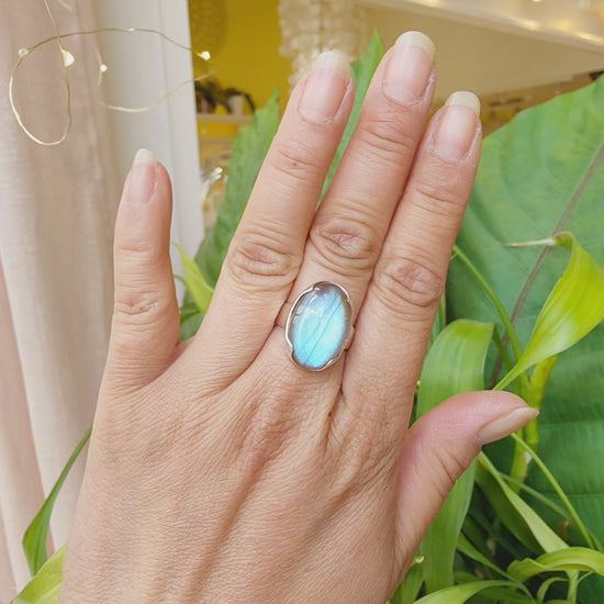 Cette magnifique bague est montée avec une Labradorite provenant d'Inde.