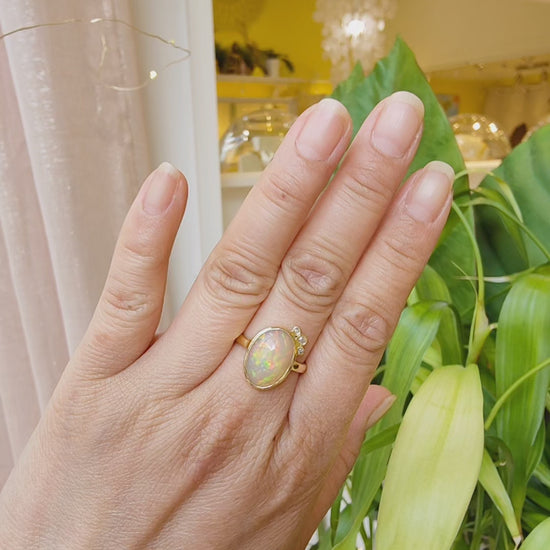Cette magnifique bague est montée avec une Opale welo provenant d'Ethiopie et 3 diamants.