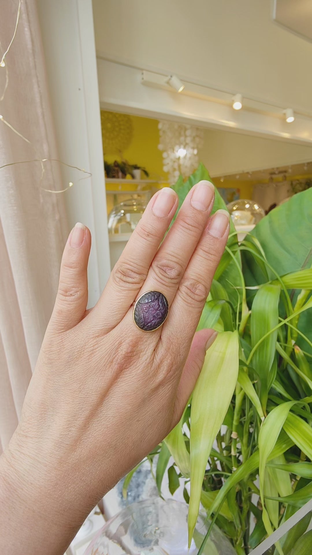 Cette magnifique bague est montée avec un Rubis gravé à la main provenant d'Inde.