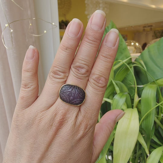 Cette magnifique bague est montée avec un Rubis gravé à la main provenant d'Inde.