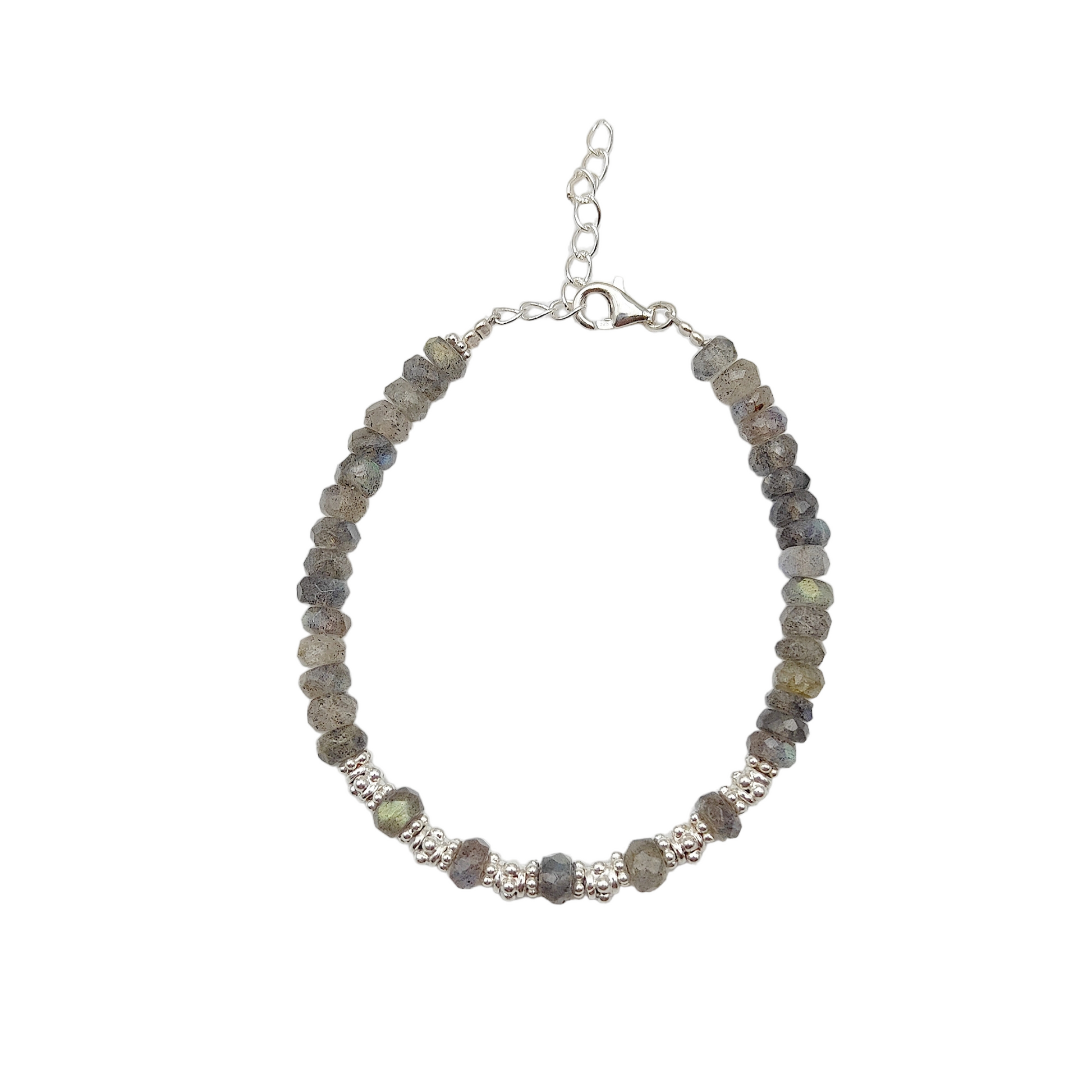 Bracelet Maggy Holy Gems monté avec des perles de labradorite sélectionnées par Magali lors d'un voyage en Inde.