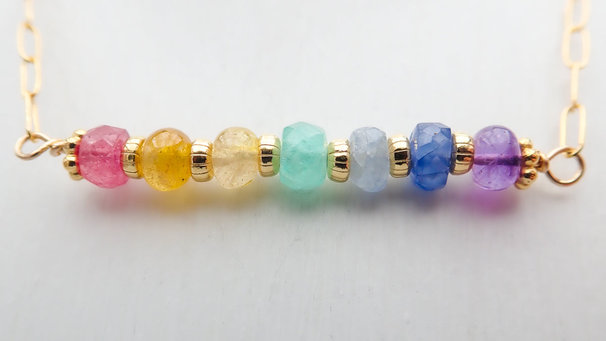 Collier Maggy Holy Gems monté avec des saphirs multicolores, une émeraude et une améthyste aux couleurs des 7 Chakras.